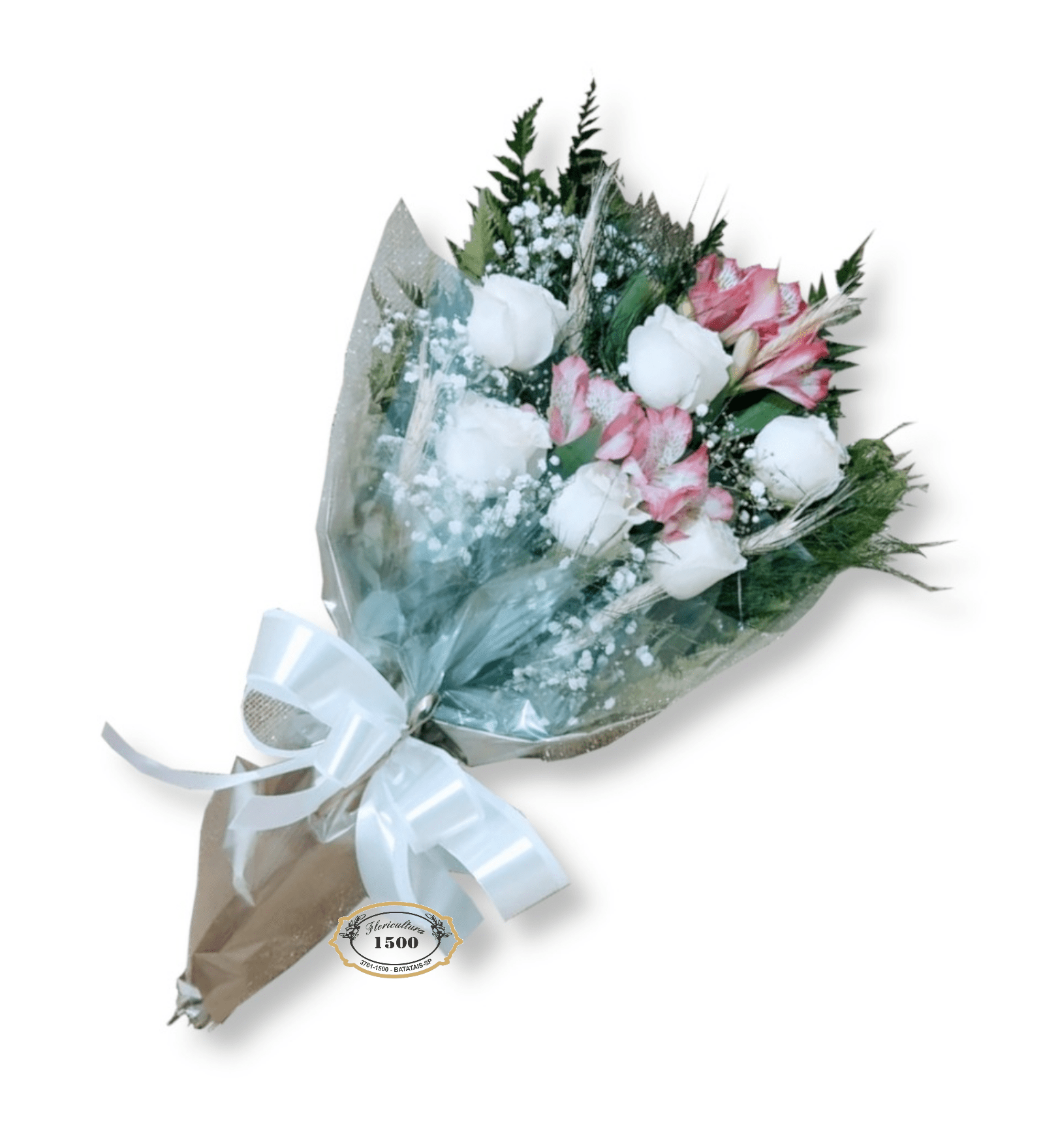 Rmalhete com 06 rosas brancas e seus complementos incluindo mosquitinho, alstroméria, trigo, embalagem exclusiva e laço combinando com as rosas