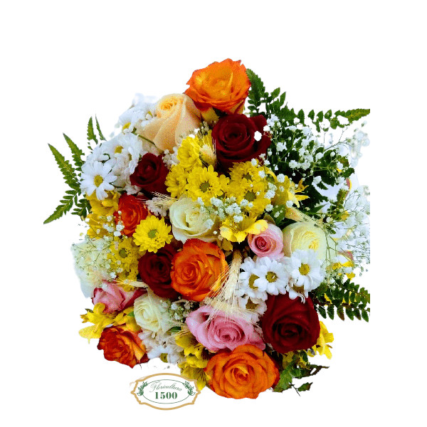 Buquê 12 rosas mistas de acordo com disponibilidade, cores aproximadas da foto, flores do campo margaridas coloridas, (podendo ter alguma alteração na cor, de acordo com disponibilidade) acompanhamentos como: folhagens gipsofila, alstromérias em embalagem exclusiva com laço na cor das flores.