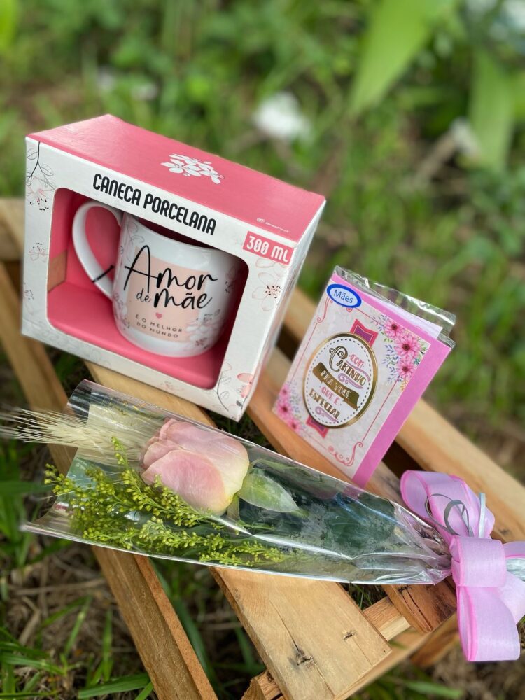Botão de rosa cor tons rosados ou champanhe, (de acordo com disponibilidade) no celofane enfeitada com folhagem e trigo, laço duplo na cor da rosa, acompanha caneca mãe, para apreciar as bebidas favoritas nos momentos mais aconchegantes e você pode presentear uma mãe especial, sua capacidade: 300 ml acompanha cartão comemorativo dia das mães, em embalagem exclusiva para presente
