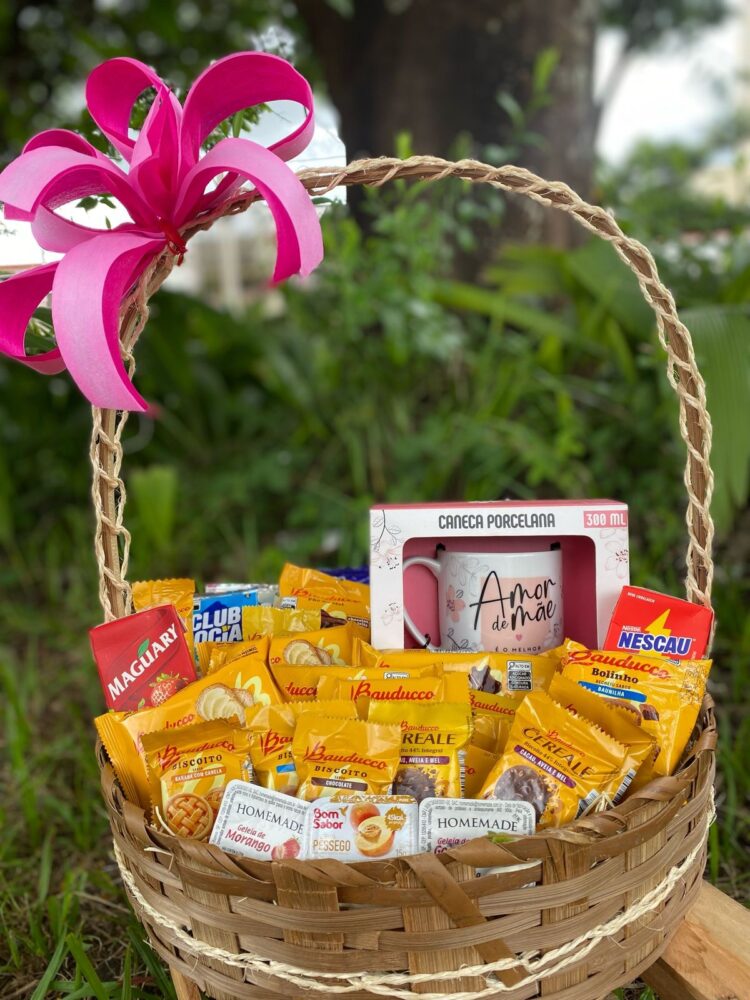 Cesta de café em cesta de bambu trabalhada em corda com: miniaturas da bauducco sendo pacotes de miniaturas de torradas, bolachas doces e salgadas, bolinho, achocolatado, suco, mini geléia, 01 caneca porcelana 360 ml Coleção: MÃE, cesta embalada com saco de cesta transparente e fecho com lindo laço