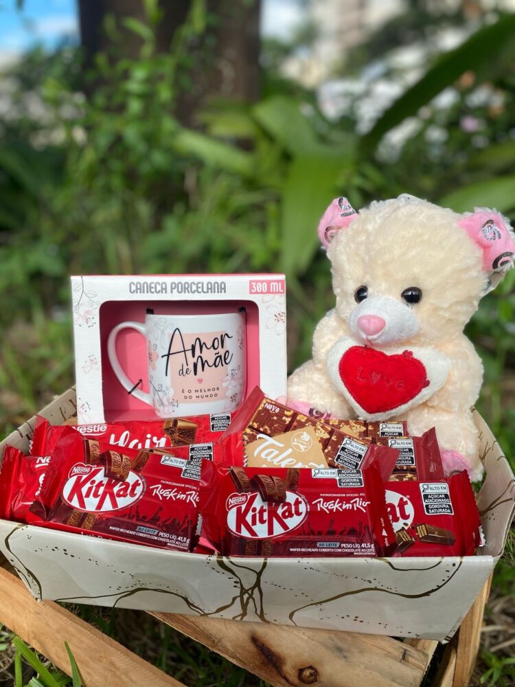 Cesta bandeja M, com 01 caneca porcelana mãe 300 ml, 01 urso de pelúcia P com coração (cores diversas) 20 cm, 03 tabletes de kit kat, 2 talentos e 2 suflair