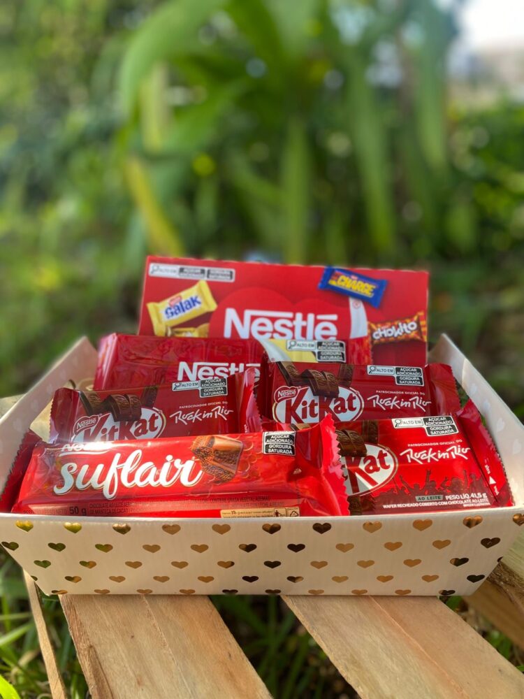 Pequena bandeja (podendo ter alteração na cor, de acordo com disponibilidade) com caixa de bombom nestlé 251 g, 03 kit kat 41,5 cada, 01 barra nestlé ao leite 90 g e 01 barra de suflair 50 g, cesta embalagem em saco de celofane e laço duplo