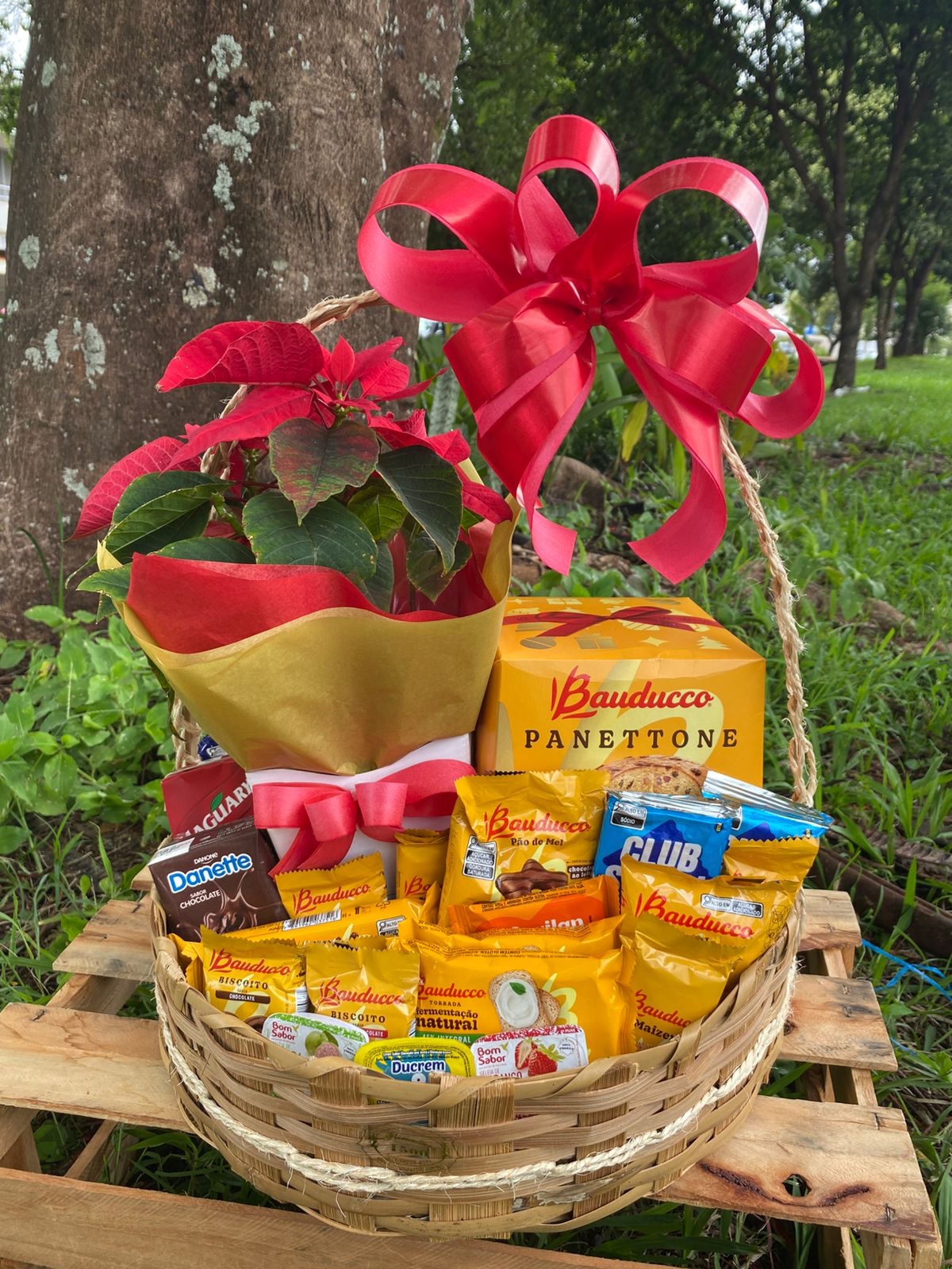 Cesta de café em cesta de bambu trabalhada em corda, com miniaturas da Bauducco, sendo achocolatado, suco, bolachas doces e salgadas, cereal, torradas, acompanha vaso de flor do Natal Pequena com enfeites e cachepô de papel e panetone tradicional bauduco, cesta embalada em celofane e laço