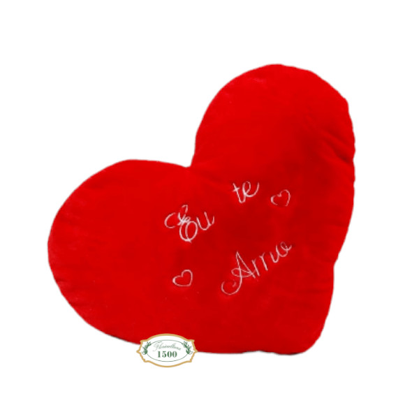 Lindo coração vermelho de pelúcia bordado: “Eu te amo” com espuma siliconada, med: 40×48 cm em linda embalagem de presente com laço
