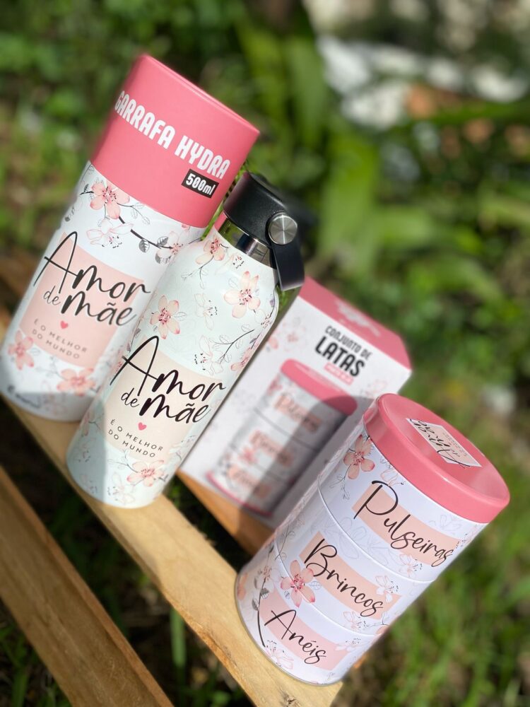 Kit mãe com garrafa térmica com grande capacidade térmica, mantém por até 18 horas com gelo, 5 horas gelado e 1 hora quente isso graças a sua parede dupla com isolamento à vácuo, material que evita a área externa de suar além de não enferrujar.Capacidade: 500 ml e Porta Biju: mãe, possui três compartimentos e você pode separar seus acessórios de uma maneira muito prática, acomodando tudo em seu devido lugar. As latinhas de metal se encaixam uma na outra e são super fáceis de abrir e fechar, com 3 repartições, em embalagem exclusiva para presente