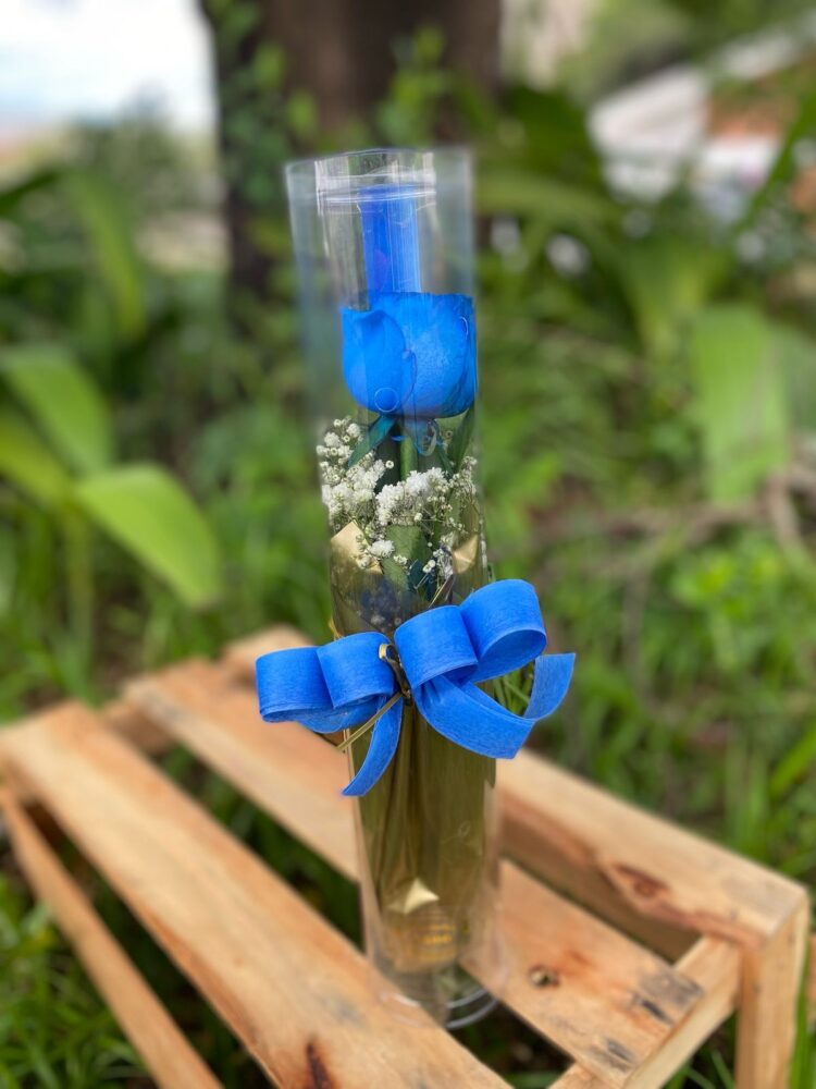 Linda rosa azul pigmentada com tinta especial, em tubo que preserva e mantém hidratada.