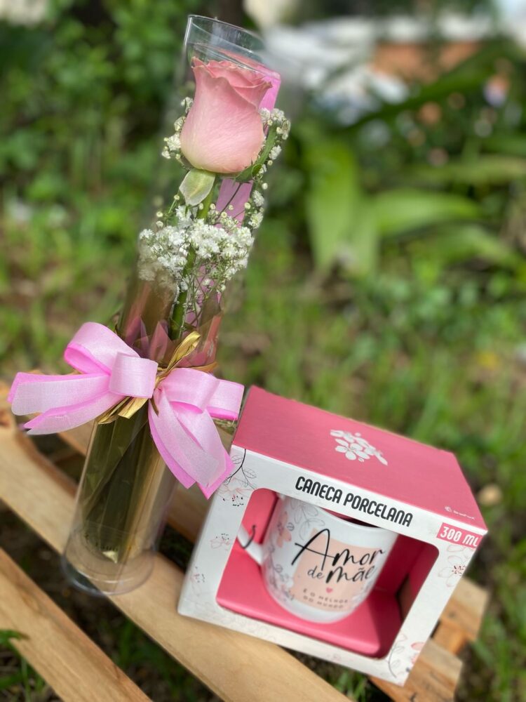 Botão de rosa tons rosados enfeitado no tubo que mantém a rosa hidratada sem precisar de recipiente com água (ideal para quem vai receber no trabalho) enfeitada com aster ou gypsofila, trigo, laço duplo na cor da rosa, acompanha caneca porcelana 300 ml coleção: MÃE embrulhada para presente