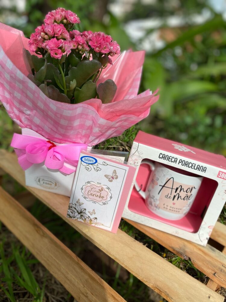 Vaso de flor da fortuna P (cores diversas) com enfeite e cachepô de papel, acompanha caneca tema: MÃE em porcelana 300 ml e cartão dia das mães em embalagem exclusiva 1500